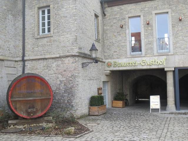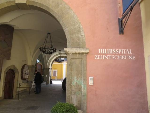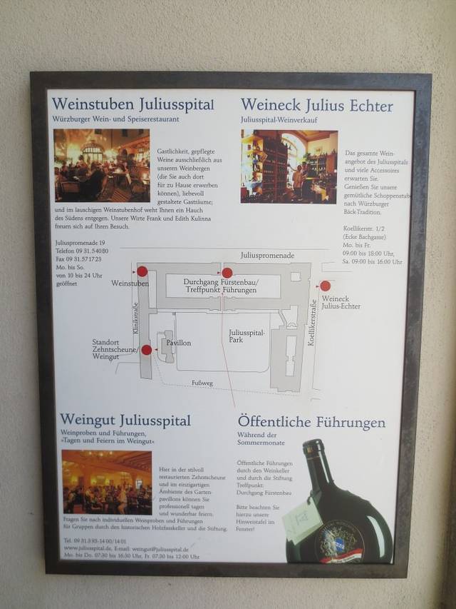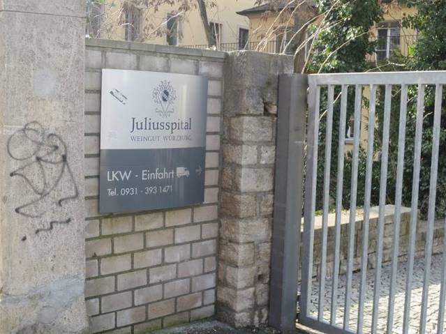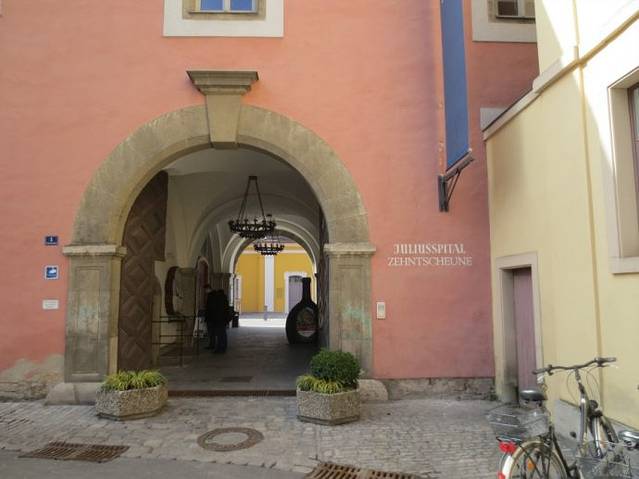 参观维尔茨堡尤利斯医院(Juliusspital)酒庄纯属偶然,因为事先并不知道维尔茨堡有这样一个著名的酒庄。2013年3月3日,中午走出维尔茨堡火车站,按事先的规划,先去火车站附近的伦琴博物馆。拿着打印好的地图,按图索骥,找到伦琴博物馆,可惜周日不开放,在门前拍了几张照片,带着失望然后向市中心出发。在一条小路上转向,走了不远,发现了下面这张照片的招牌。大门开着,向里张望,院落挺大,刚好看到有两个背着背包的游客,于是折进了大门。后来查资料才知道,这就是维尔茨堡著名的尤利斯医院酒庄。
