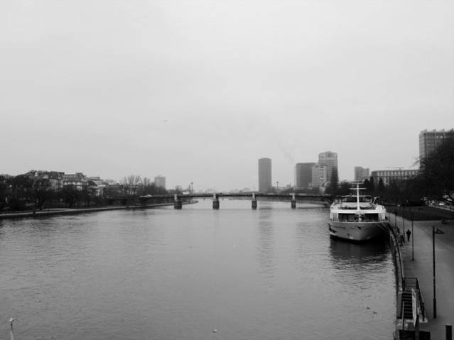 美茵河水静静地流淌,在流水中体味那凝重的历史、辉煌的过去、城市的脉动,阴沉的天气下,拍出的照片体现不出任何美感,索性调成黑白色。