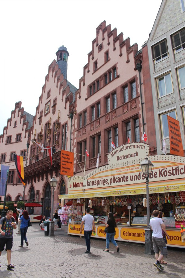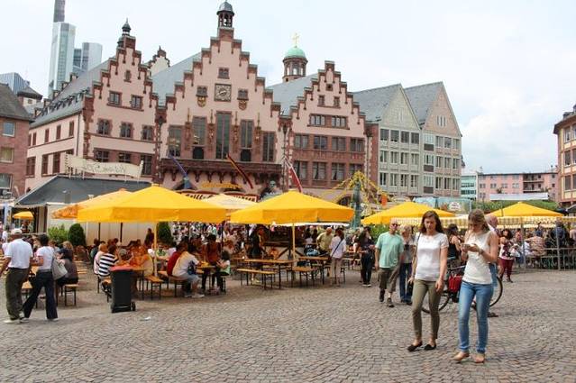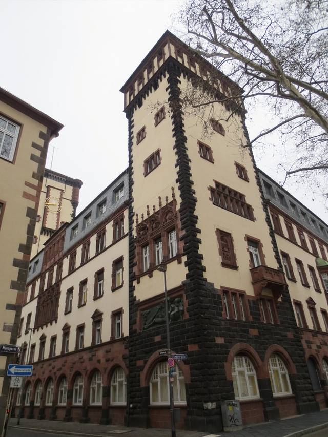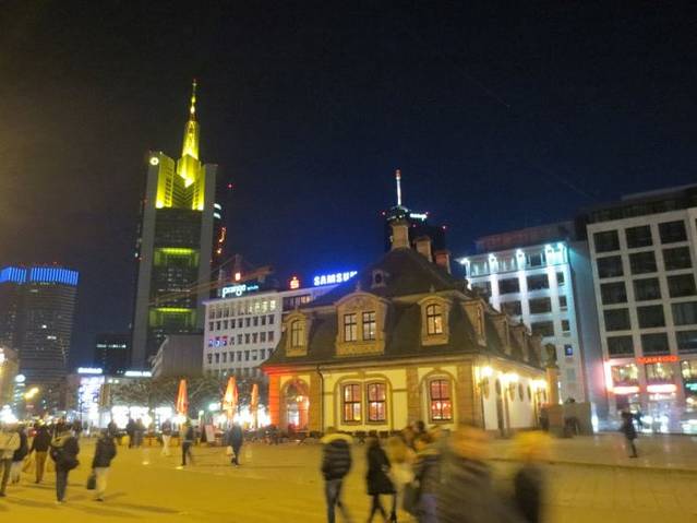 广场上这座古色古香低矮的建筑物是卫戍大本营(Hauptwache),在寸土寸金的商业街上能独善其身而不被拆除必定有它的独特之处。这座巴洛克风格的建筑建于1729-31年,曾经是法兰克福最重要的“警察局”,今天这里成了城市的中心。1833年卫戍大本营被起义的民主主义者占领从而名声大振。从三星标志的大楼拐过小胡同,就是著名的奢侈品街,那里是富人们购物的天堂,中国人的面孔在商店里也经常看到。