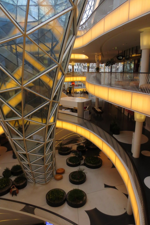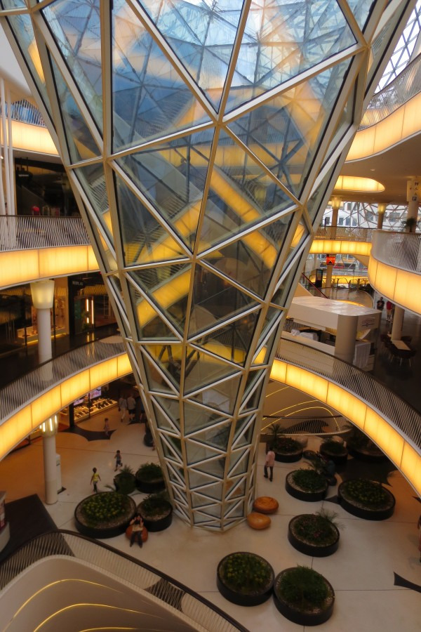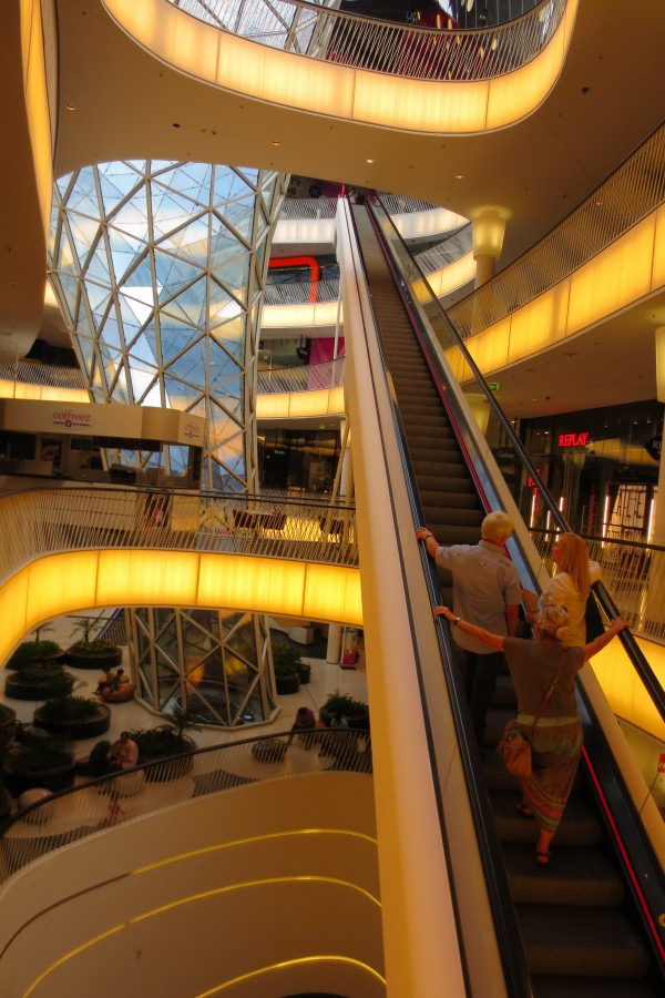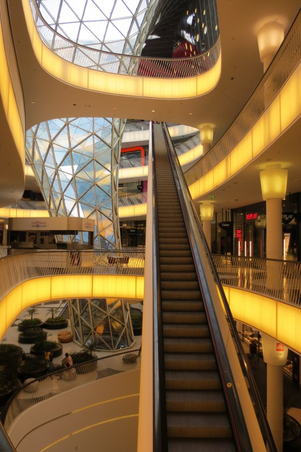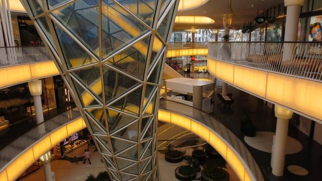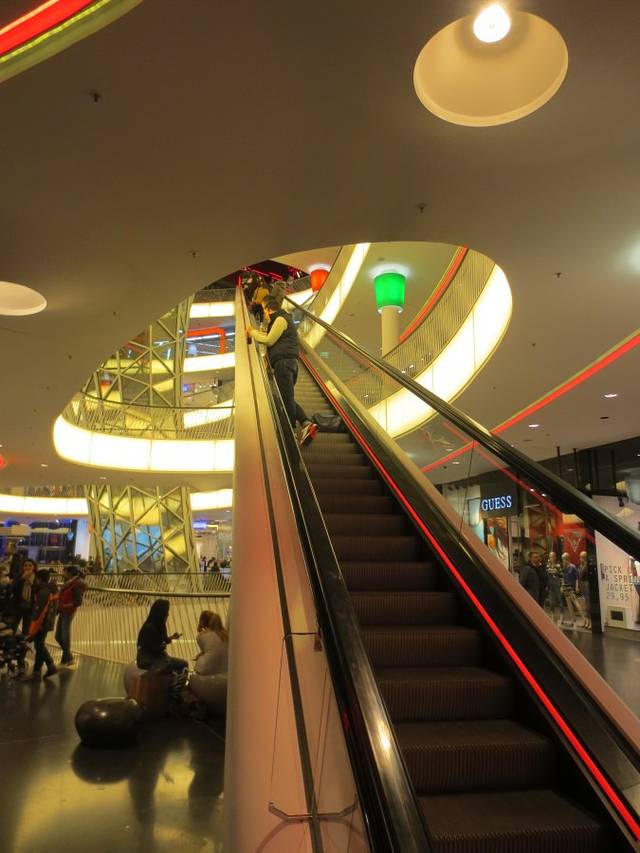 在购物中心底部有一个长达47米的自动扶梯直达购物中心六层。但有上去的自动扶梯却没有下来的,其目的是想让顾客一边看商品一边从缓和的斜面道上走下来。