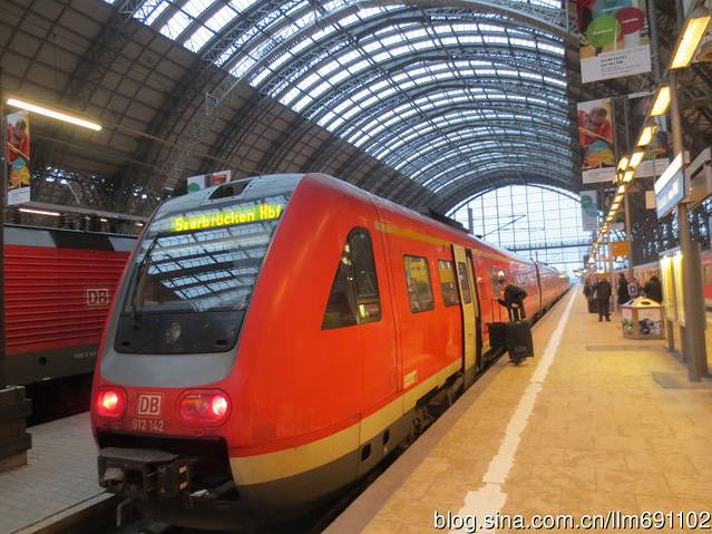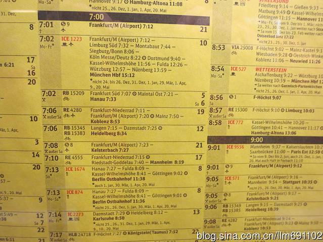 到地下一层“Regionalbf”坐轻轨去市内。有S8和S9到市内,找准方向,不坐到反方向Wiesbaden威斯巴登就好,站内有时刻表,离开时刻表为黄色,到达时刻表是白色。找好时间和站台,S8到站,上车,只有3站,10多分钟就到了法兰克福主火车站。