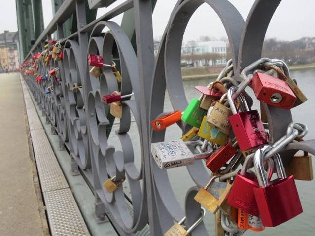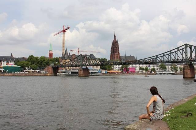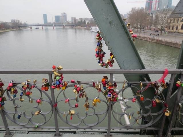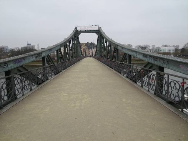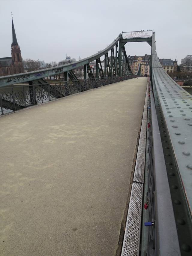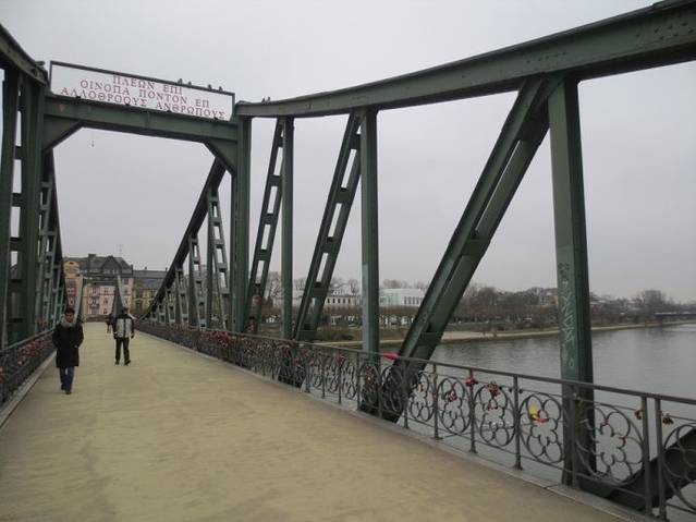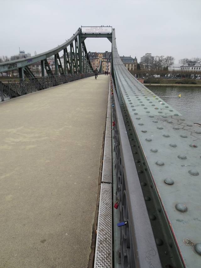 从罗马广场沿着路边带有格子屋的小路直行,步行过马路,就来到了美茵河边。但凡有特点的城市都离不开水,水赋予一座城市以生命,给城市增添了灵韵,增加了城市的生动。美茵河可以说是法兰克福的母亲河,法兰克福这座城市正是因为有了美茵河,才从一个默默无闻的小渡口发展成为一个世人皆知的欧洲金融中心。美茵河水哺育了这座城市。美茵河是欧洲一条主要的河流,全长1320公里。大部分河段在德国境内。弯弯曲曲的美茵河畔蜿蜒约400公里,是莱茵河最美的一段。美茵河流经市区,将法兰克福一分为二,市中心和内城在美茵河北岸,美茵河上众多的桥梁把内城与近郊萨克森豪森地区连接在一起。在众多的桥梁中,比较有名的就是爱塞尔纳铁桥(Eiserner Steg)。单从某些方面说,中国西北的兰州与它比较相像,黄河水穿城而过,河上一座著名的中山大铁桥。