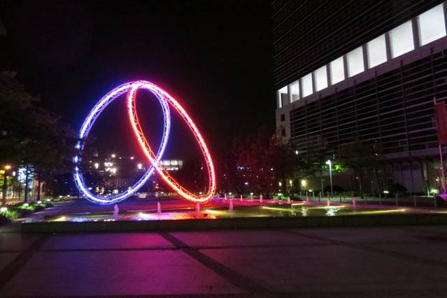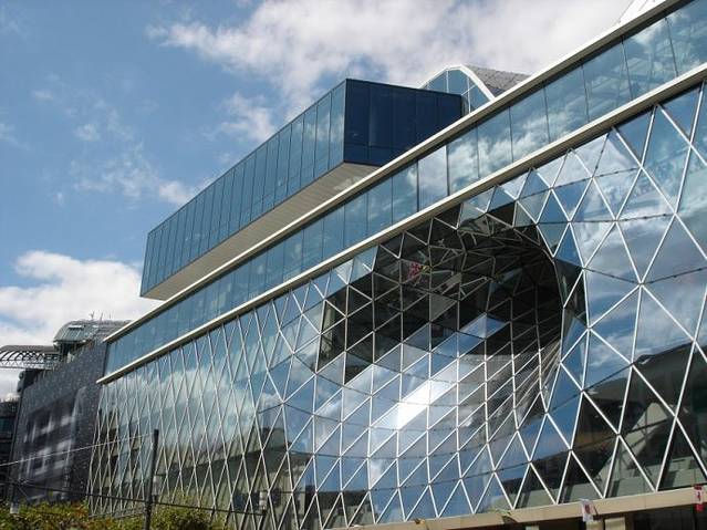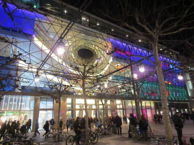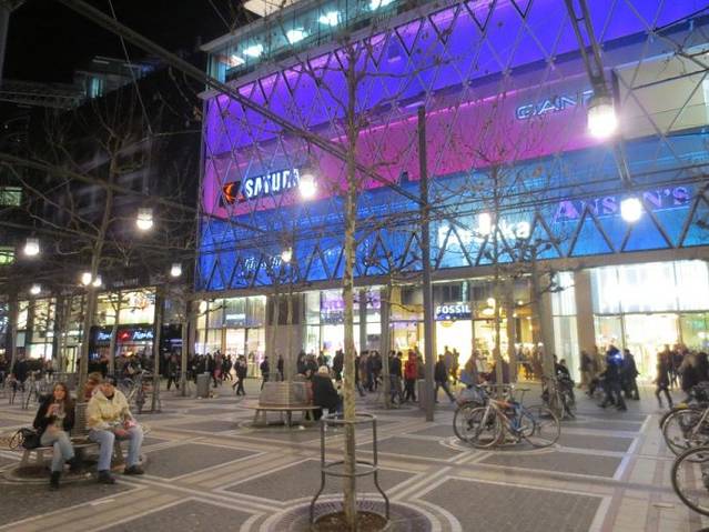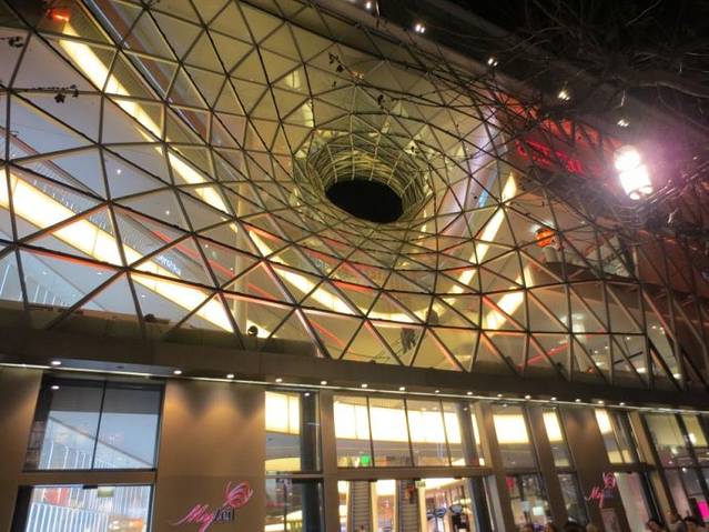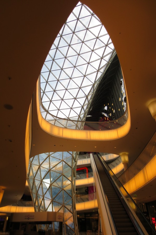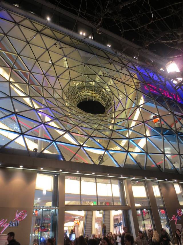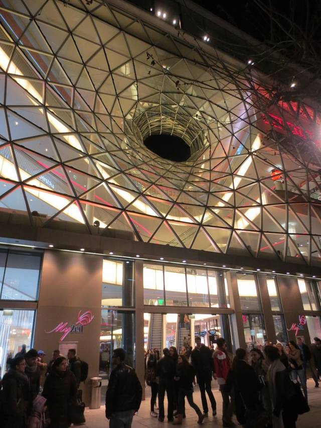 考霍夫(Kaufhof)百货商店的旁边是独具特色的购物走廊“My zeil”(中文戏称“买菜儿”)。巨大的洞洞好像建筑物的大眼睛,在黑暗的夜晚和迷人的灯光下更显出它的深邃,有人称之为“时尚之眼”,也有人称之为“龙卷风”,你只有走进商场,才能体会它设计的巧妙,装潢的的独到。巨大的建筑完全是钢筋龙骨,透明玻璃,透光性极好。