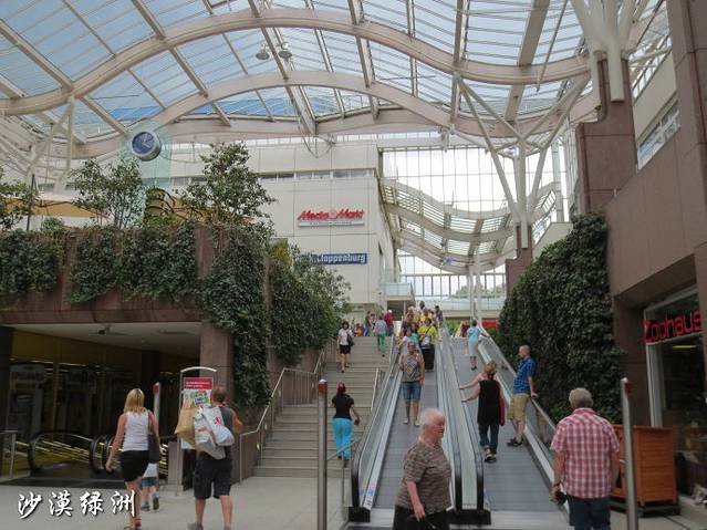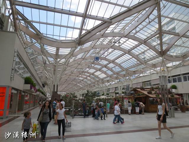 NordWestZentrum 西北中央商城的购物长廊,长廊顶端是透明的玻璃,在购物的同时,可以享受阳光的抚摸,欣赏蓝天白云。购物当天,突然遇到阵雨,商场内却丝毫不受影响,看到雨水噼里啪啦地落到屋面室内却没有一滴水。国外建筑的防水工程做的真好,有内天沟也看不到漏水,很是佩服。