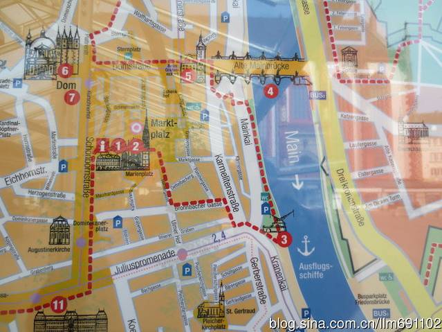 沿着牌子上的旅游路线,从Marktlatz向美茵河边走去,想看看河上著名的老桥,再体会一下维尔茨堡的美茵河与法兰克福的美茵河有什么不同。