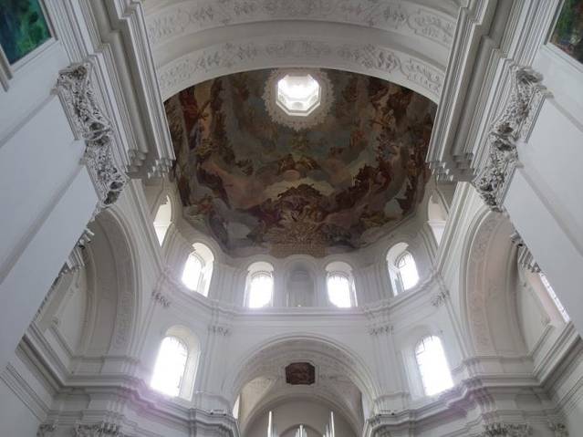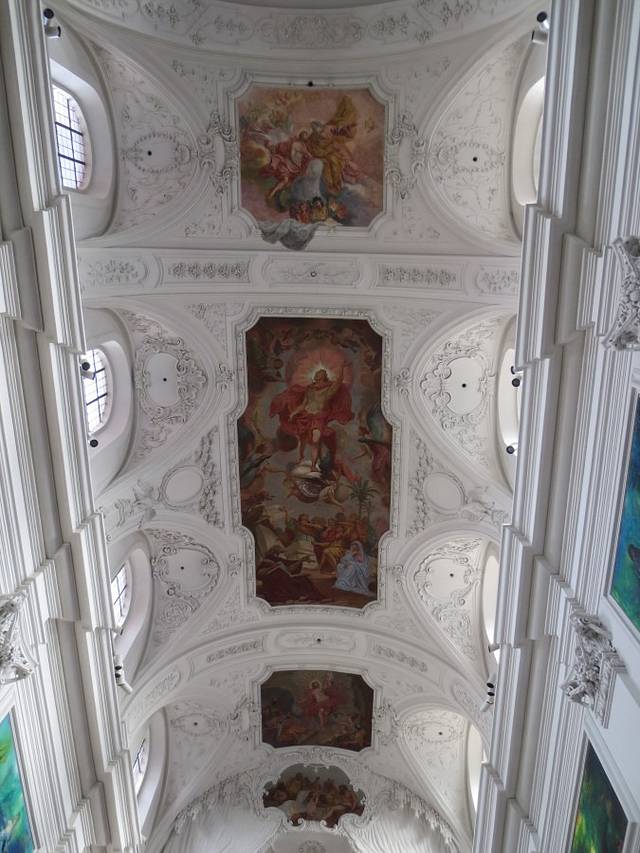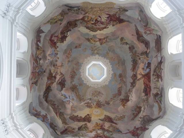 教堂顶部精美的壁画,光线从顶部西周的窗户投射进来,聪明的设计充分运用了自然采光,使顶部看上去精美如盛开的花朵,又如一倒扣着的薄壁透亮的中国瓷器—碗。