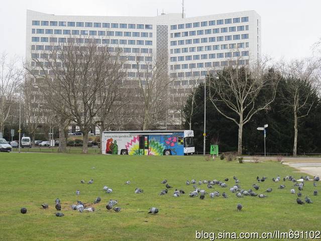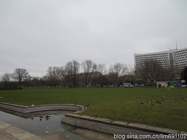 火车站对面是宽阔的广场和大片大片的莱斯格草地,草地上成群的鸽子在自由地觅食翱翔。这幢13层的大楼大概就是联邦统计局。
