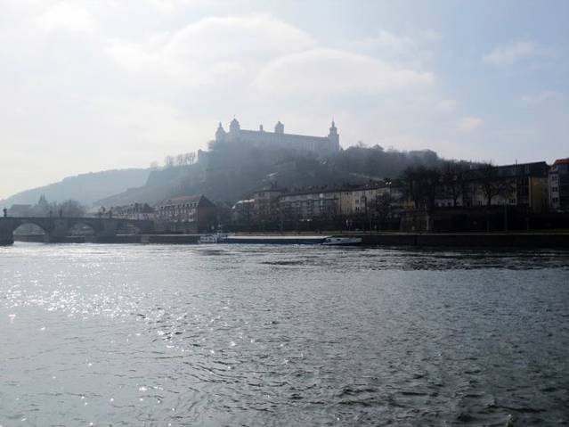 在Main河边远眺玛利恩堡 (Festung Marienberg),正午太阳当头,城堡在照片中有些逆光,不是很清楚。城堡下的桥梁便是古美茵河桥 (Alte Mainbrücke)。阳光照在河面上,波光粼粼。