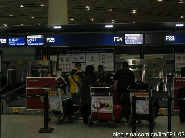 又一次要去德国,但是加上往返,仅有短短的10天。为了能在德国多待一天,预定了3月1日国航半夜2:00飞往法兰克福的CA965飞机。2月27日下午乘飞机5:30到达北京T3机场,乘机场快轨去预定的宾馆,特意看了一下晚上最后一班地铁10:50,就是这一看坏了大事,不如当初上网查询了。28日在宾馆待了一天,为晚上补觉,看到手机收到的短信,长春暴雪,机场关闭,庆幸自己的英明决定。28日吃完晚饭,晚上10点离开宾馆,坐地铁到东直门正好10:30,开往机场的快轨刚刚离开。原来机场快轨晚上的时间是:T3机场10:50,东直门10:30(10:28停止售票)。没办法,和别人拼车,打车去机场,每车200元。23:10到达首都T3机场,国航办理去法兰克福的柜台在F区F24窗口,可以看到办理登机的并没有多少人。