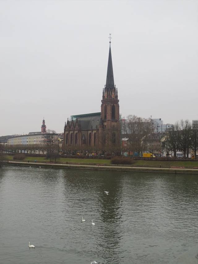 美茵河岸边的一座教堂,叫不上名字,与岸边低矮的建筑相比高耸的尖塔更显得鹤立鸡群,冬日阴沉的天气下,显出一种雄伟与庄严。