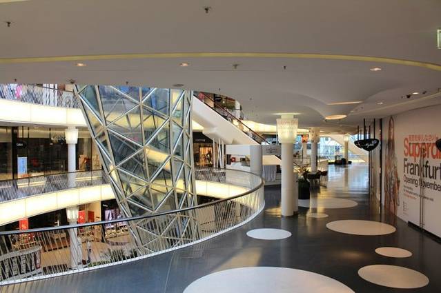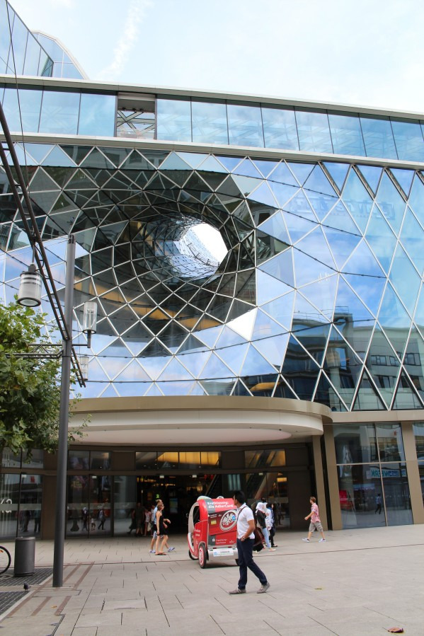 按照德国法律规定,星期天所有商场和百货店均停止营业,让人们享受阖家团聚的快乐。虽然商店不营业,但有些商场却照常开门,以便于人们浏览橱窗的精美布置,欣赏建筑的艺术之美,在商场观景平台上一边喝着咖啡一边领略优美的城市风光。当我们徜徉在法兰克福的街头,漫步来到采尔大街时,在我的强烈建议和推荐下,大家去领略MyZeil购物中心的建筑和艺术之美。数次来法兰克福,只要到采尔大街,我都要进MyZeil去逛逛,原因是它给我留下的印象太深刻了,从见到它的第一眼起,我就被它独具创意的建筑外貌所吸引,惊艳的建筑之美给我强烈的视觉冲击,彻底被它征服了。