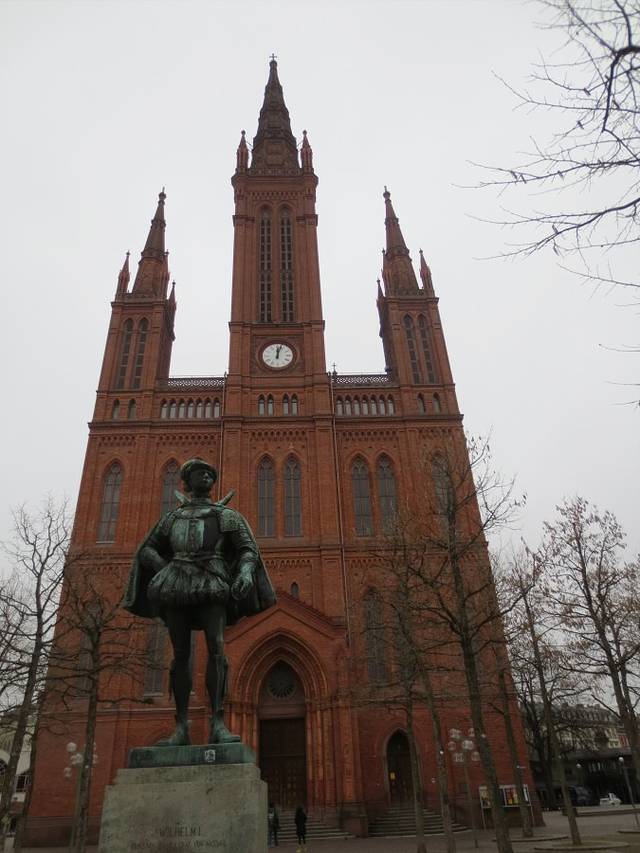 1908年5月15日,威廉·欧朗尼王子的纪念雕像在威斯巴登集市教堂前落成,这座纪念荷兰开国国父——沉默者威廉一世的雕塑是德国皇帝威廉二世送给威斯巴登的礼物。为了给德国皇帝的礼物寻找一处合适的地方,威斯巴登造了一个和真人大小、由木头和厚纸板做成的模型,拉着它在市里各处转悠,最后,还是德国皇帝威廉二世亲自下令,把雕像放在了集市教堂前的小广场上的。