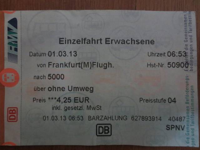 在自动售票机购票去市内,由于有了数次在DB售票机上购票的经历,买票已不是什么大问题。法兰克福的售票机最大只接受10欧元的纸币(慕尼黑是20欧),到市内4.25欧,投入5欧元的纸币,拿到票。