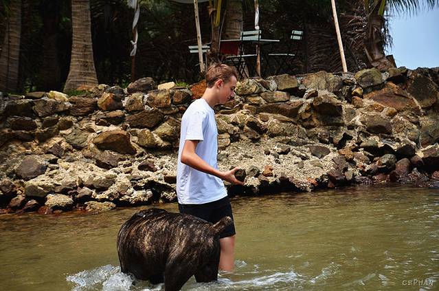 一个来自欧洲的人在那里开了一间租皮划艇的小店,供应新鲜的水果汁,休闲的沙滩椅随意的摆在沙滩上,三条狗跑来跑去。