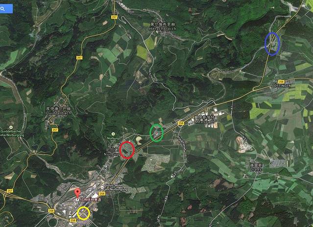 整个赛道的示意图。绿色圆圈是赛道入口;红色圆圈是D9停车场,是离入口比较近的停车场,其实入口外面的环岛边上也有停车场,不过不大;黄色圆圈是客户中心;蓝色圆圈是拍谍照的地方。