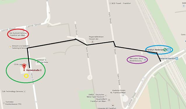 黑色是路线图。蓝色圈是Frankfurt (Main) Niederrad Bahnhof轻轨站。紫色圈是一个奔驰的销售中心可以作为方向的标志。红色圈是谷歌地图上标的sixt的位置。绿色圈里有地点标的为实际的租车位置,它是在一个叫Innside Premium 酒店的一楼大堂,只有一个柜台。出酒店的大门右转也就是酒店南边紧挨着酒店就是sixt的停车场(黄色小圈)。这个租车点是18:00下班,如果晚于这个时间还车,只要把车停在车场,把钥匙留到酒店前台就好。