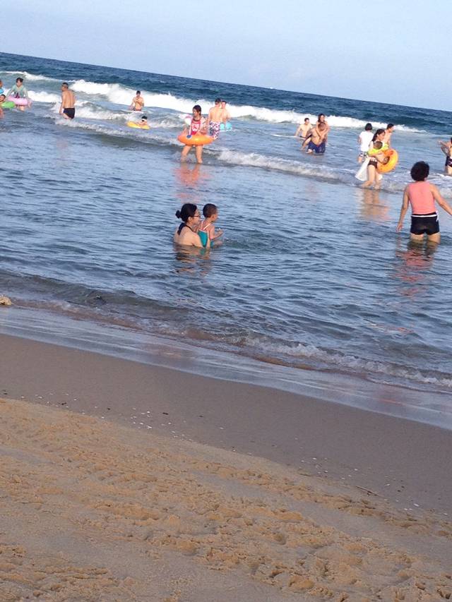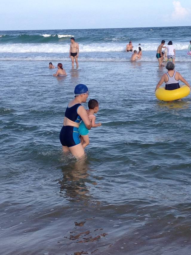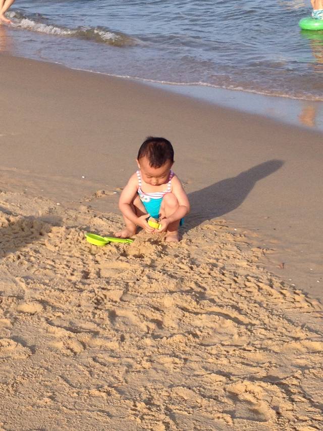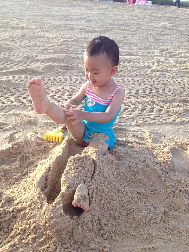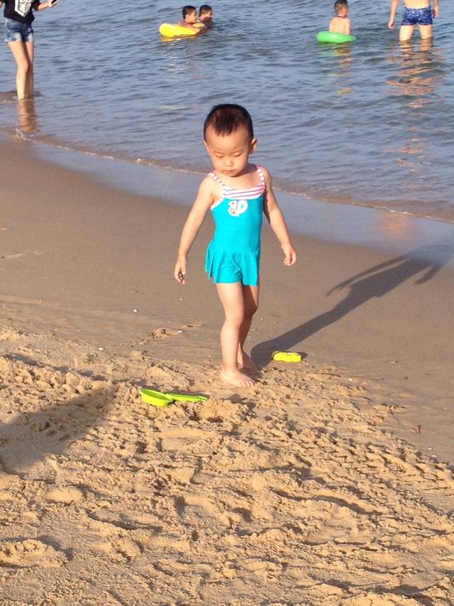 看着一望无际的大海,心情真好,会忘掉烦恼,忘记时间,彻底放空!每天基本上都会去海边,有时为了近,就p6最近的海滩。7月份 白天太阳还是非常猛烈的,可能晒一会宝宝就晒黑了,所以一定要带防晒霜,海滩上也有当地人出租太阳伞,小椅子,如果宝宝玩得时间不长就自带太阳伞吧,爸爸妈妈轮流下海游一下,轮流陪宝宝玩沙子。不会游泳的下海一定要带游泳圈,小朋友也可以在比较浅的地方感受一下海浪拍打过来的感觉,爸爸妈妈做好保护工作,还有一定要多拍几张照片