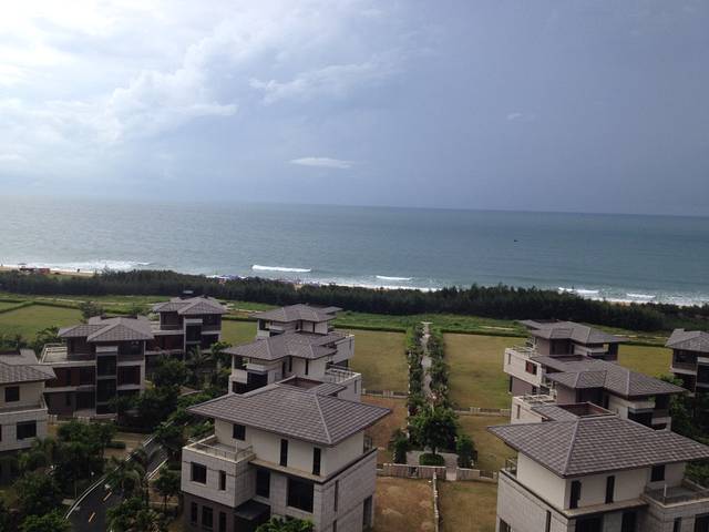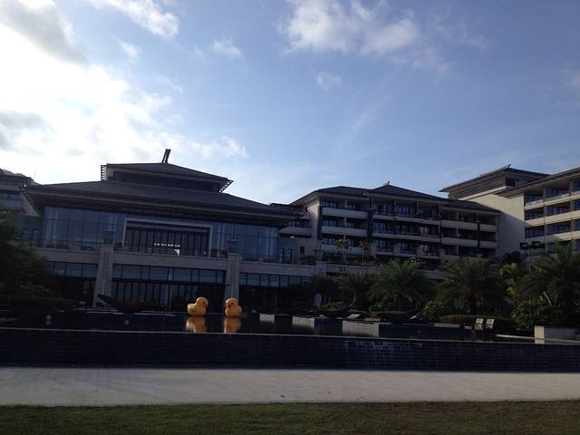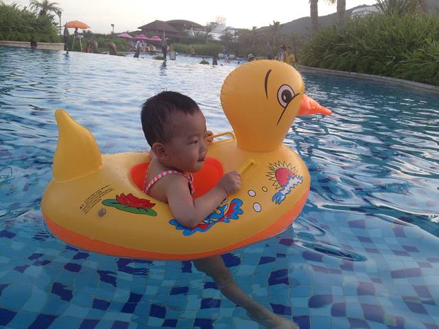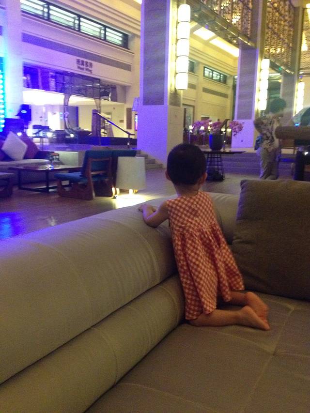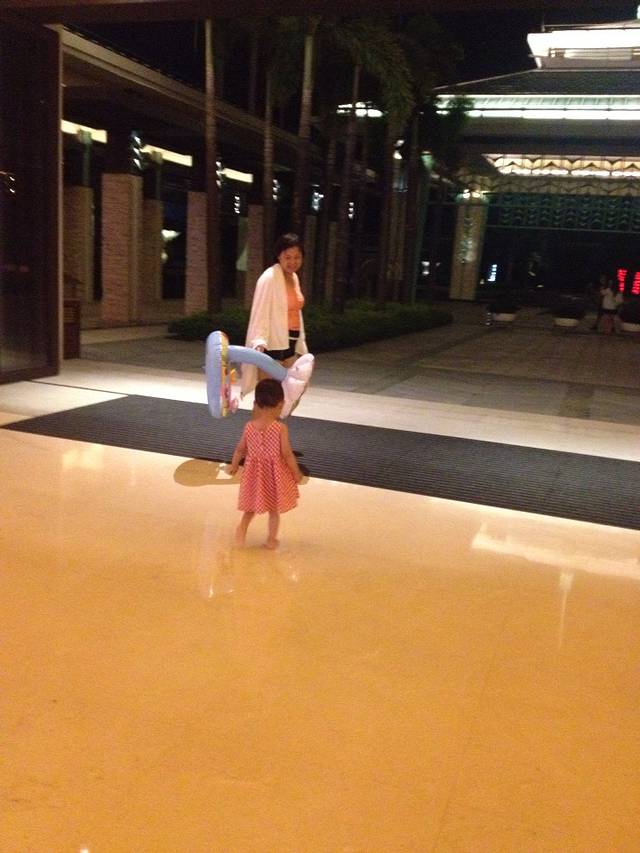 第一天先去了保利p6不远处的海边,风有点大,考虑到2岁的宝宝激动得想游泳,我们就步行往豪华大酒店那个方向走去,步行15分钟。后来有经验了就是坐敞篷三轮车,3,4分钟就到了,4个人给8元。 酒店从正门进入大堂,特别气派高大宽敞,往里面径直走就看到楼下不远处广阔的大海,面朝大海右右边走楼梯下到一层,一层分别有酒店落地窗餐厅,空旷广场中央的游泳池,开放式的,还有旁边独立的儿童池,一周多半时间人不多。
