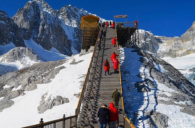 司机是个很有经验的人,告诉我们要一大早去,这样可以不用排队。去玉龙雪山,开车路上1小时不到,进入雪山前要买票,并且会检查每个人的古镇维护费是否有买。然后开车进入风景区,到索道的位置大概又半小时。此时,我们已经到了3000米的海拔高度了,还好,没什么不适的。这天天气晴朗,我们带着厚棉衣和氧气瓶开始上山。