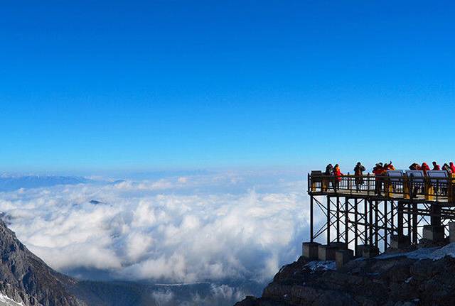 玉龙雪山有3条索道,我们乘坐了最大的索道。据说全世界这种级别的索道只有2条,另1条在法国阿尔卑斯山上。索道很棒,一大早不到9点时还没人排队,我们很轻松单独一箱。一片云柏树在脚下划过,清淡的白云飘来,如身在画中,感觉浑身轻盈无比,有种雀跃的冲动。索道有一段几乎达到80度的角度上升,很让人刺激。看远处的山谷像小蛇一样盘旋,心里才会感慨,难怪小时候自己总画不出这样美的山,因为从未见过如此美景。