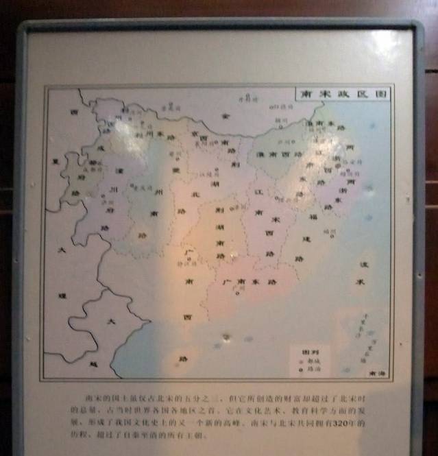 阁内是对南宋时期历史文化的展示。这一张是南宋政区图,下面的注释讲南宋的面积只有北宋的五分之三,但是GDP总量超过北宋,且是当时的世界首位。我国上下五千年历史中,是不是第一了四千九百年?