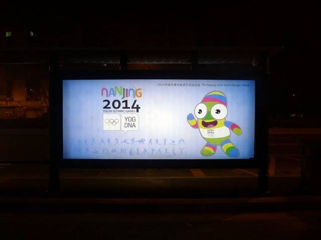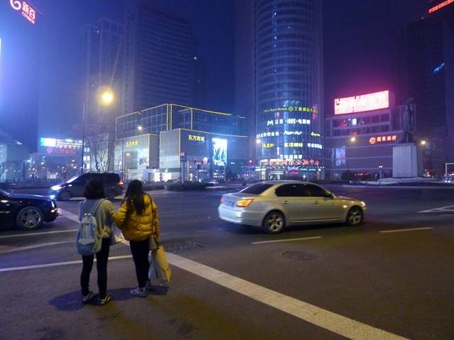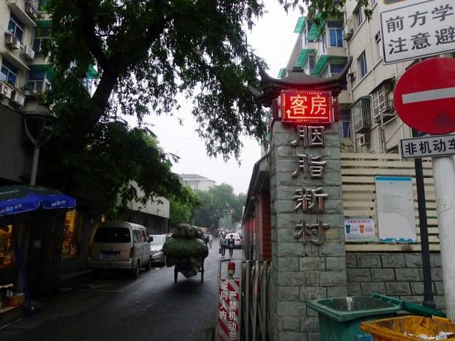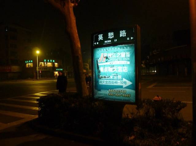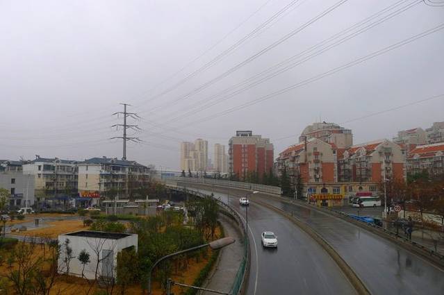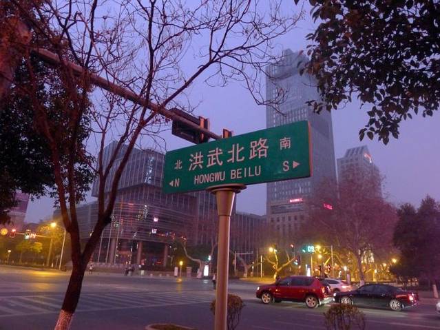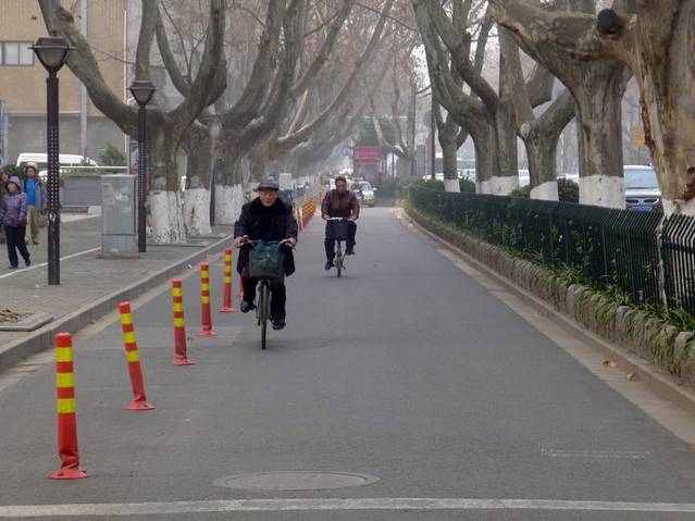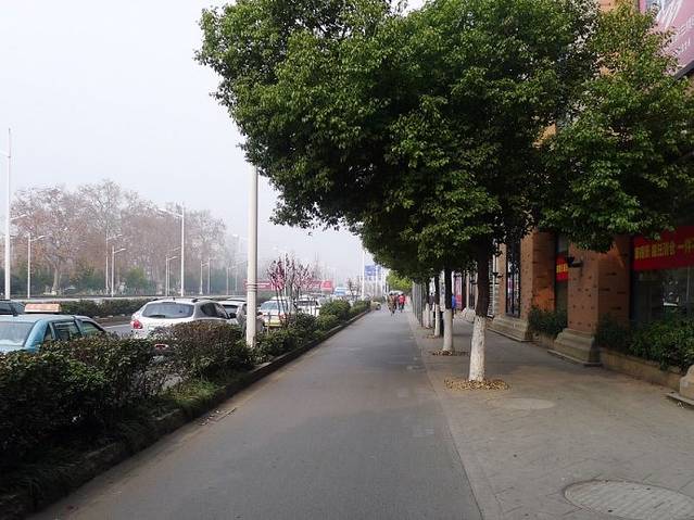 我从南京禄口机场乘巴士到达市区。从这张图片可以看到人、自行车、机动车分流的很充分。另外,五九季节,这里有绿树,路旁种植的是香樟树。看来“一九二九不出手”这个九九歌只适用于中原地区。