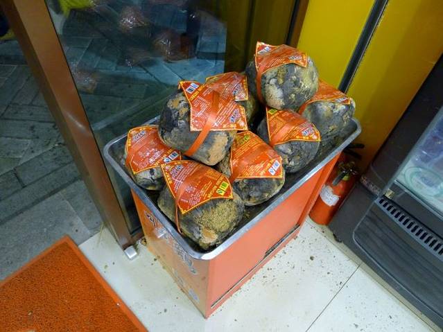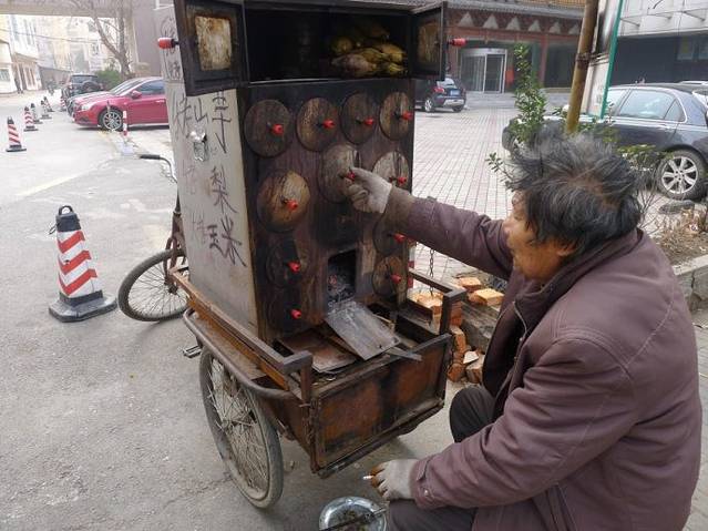 这位烤白薯烤玉米的先生,把白薯和玉米放到一个小抽屉里烤。北京好像都是直接放到汽油桶上面烤。