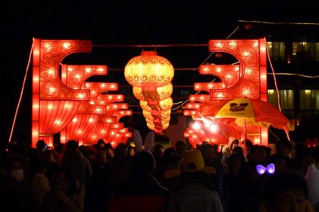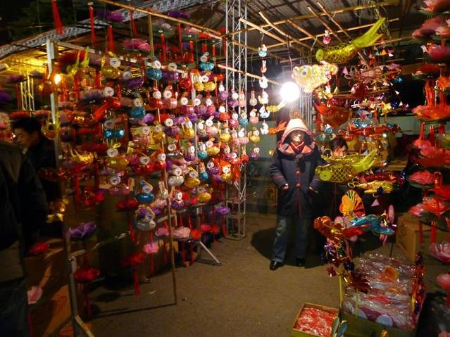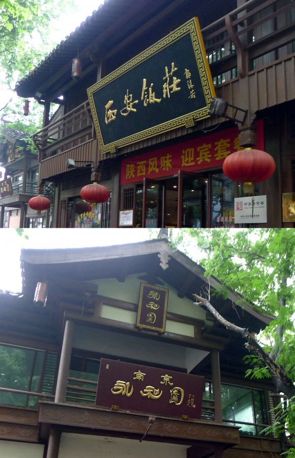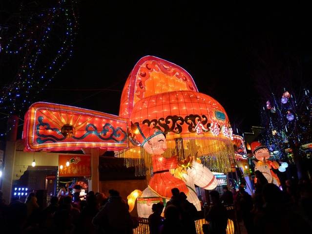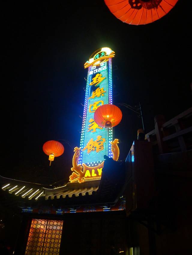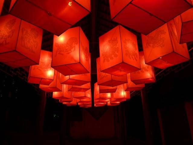 这一家该是个饭店吧?把菜名都写在灯笼上。