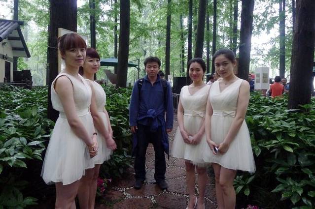 这是一位画家在西湖边举办画展,画展很有西方味道,画作就挂着树上,宾客们穿着正装,踱来踱去观看画作,展区里还提供点心和香槟。如果你想到苏轼等人也曾在此听着琵琶喝着黄酒舞文弄墨,是不是颇有穿越感?