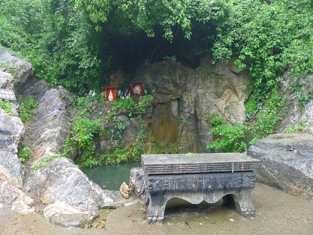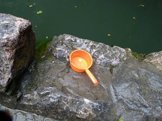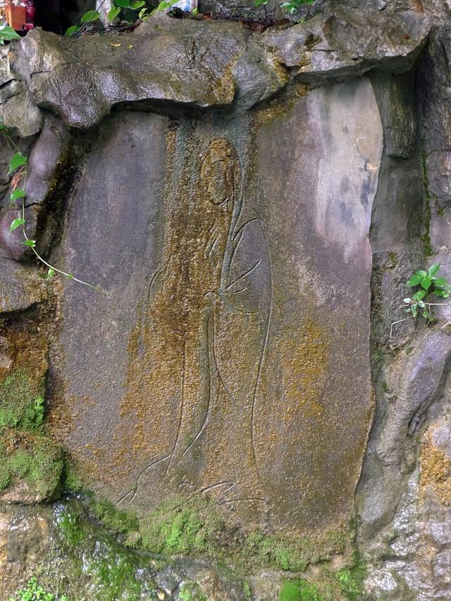 这一处叫做泼水观音。较平的一块崖壁上,几个简答的线条勾勒出一幅观音像,像上长满苔藓,面前的水池旁还放着一把水舀,我想不用多解释大家都该知道应该怎么做了吧?这种祭拜的方式很新颖吧,我满喜欢的。