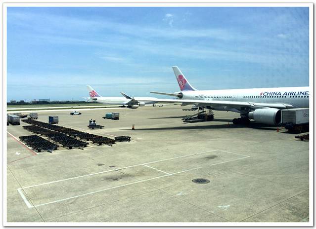 中午十一点半降落在台北的桃园机场,预报地面温度为34摄氏度。