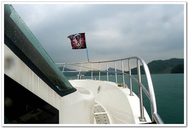 我们乘坐的游艇维多利亚号,船头挂的旗子图案貌似海盗,哈。