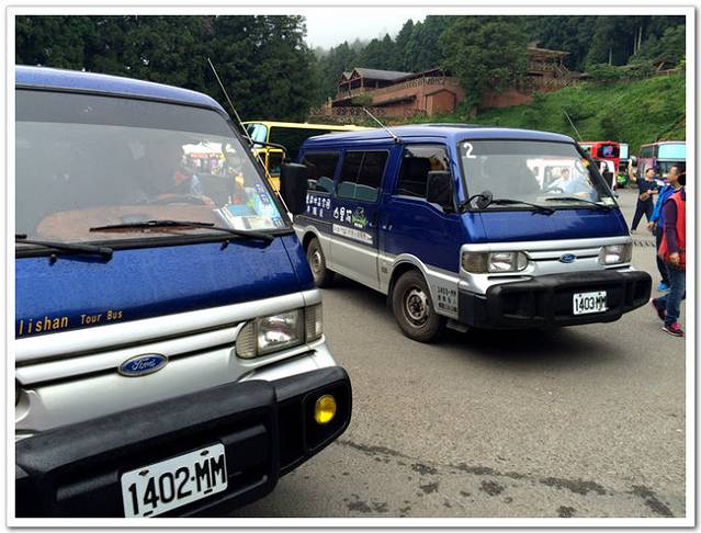 从旅游大巴的停车场下车,再转乘阿里山景区提供的专用小巴达到步行进山的地点。