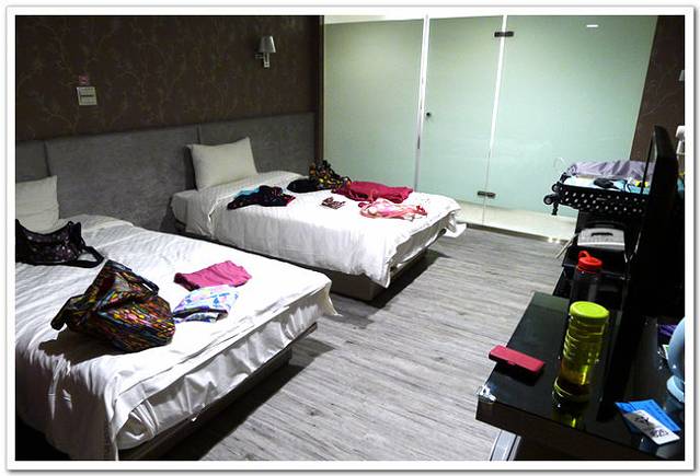 房间内有一张大床,一张小床,卫生间用磨砂玻璃隔开。
