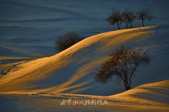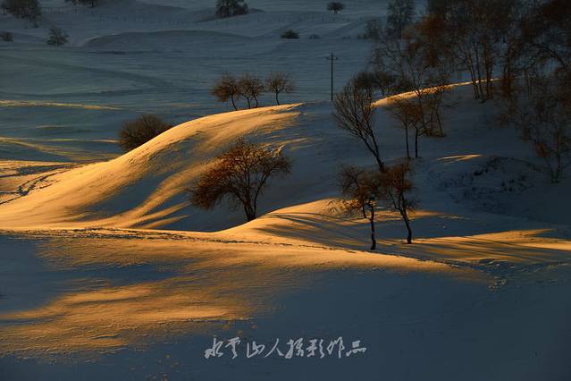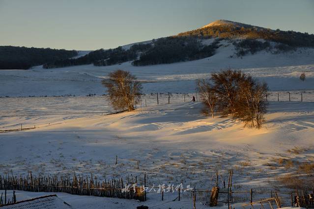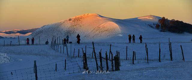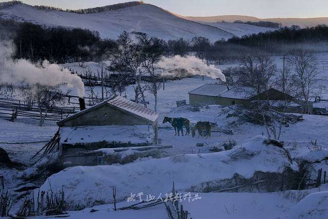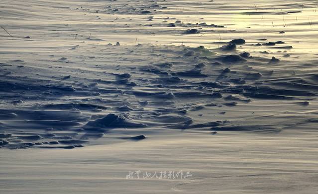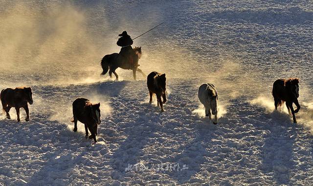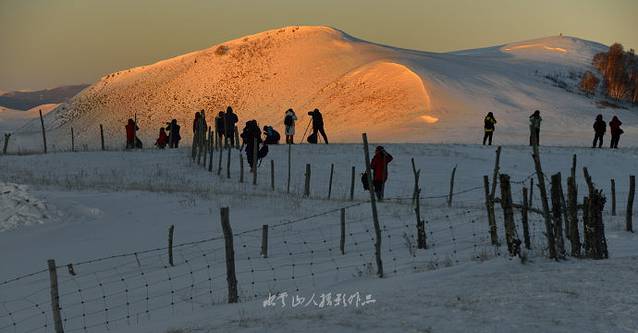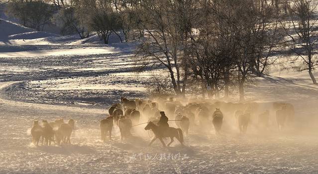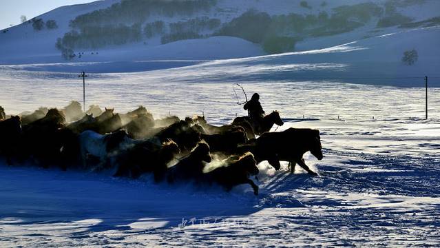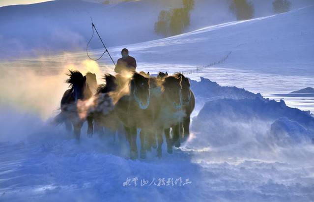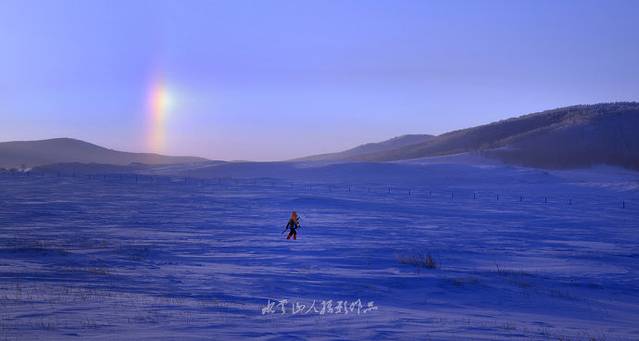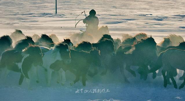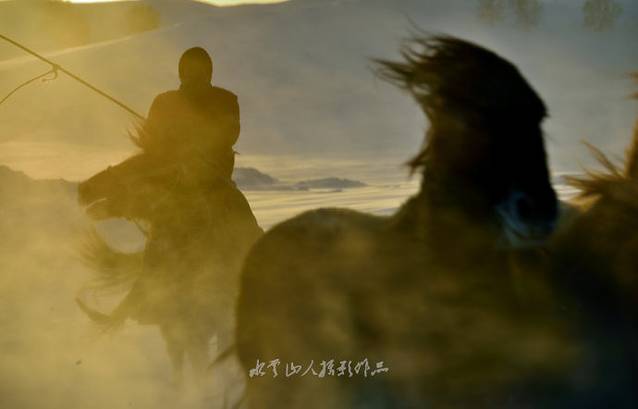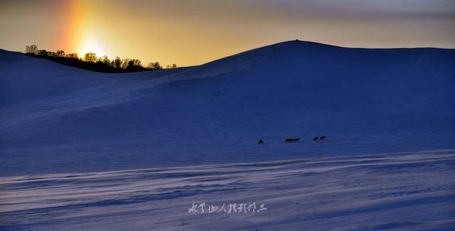 16:10继续向前,到杨树背拍摄日落。当时天更冷,草原上深深的积雪被白毛风刮割得如同凝固的惊涛骇浪。山头的落日挥洒着最后的暖红色余晖,日珥围着摇摇欲坠的夕阳。碰巧赶上别人租的马队,但他们拍摄已近尾声。我们赶紧抄起相机蹭拍,由于事先不知情,没有任何事先准备,拍摄效果虽然不十分满意,但那马、那人、那景、那氛围已经令人感到非常地震撼。这应该就是唐代边塞使人岑参所写的“马毛带雪汗气蒸,五花连钱旋作冰”的景况了吧。