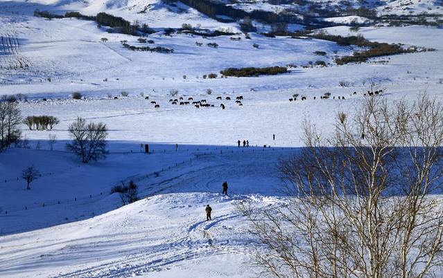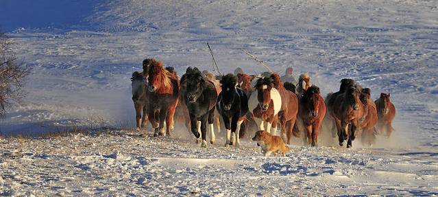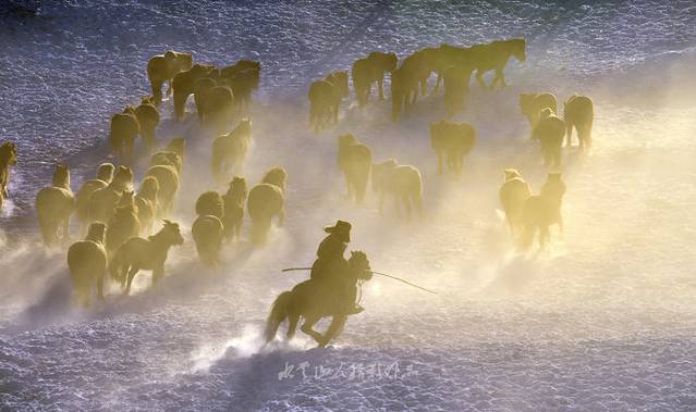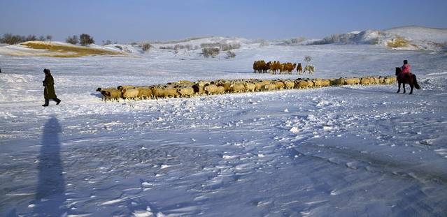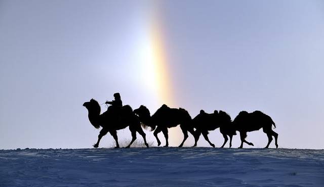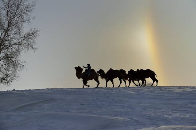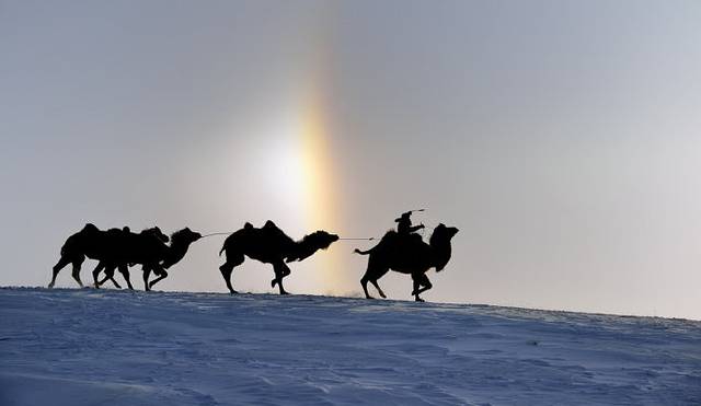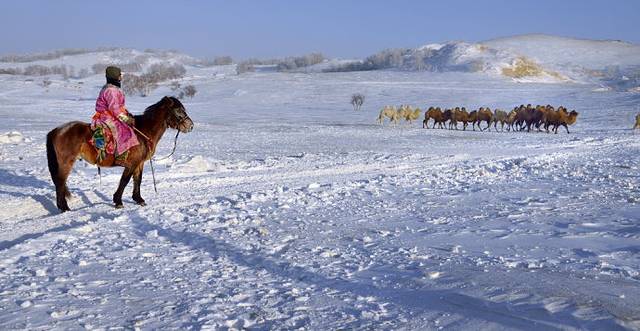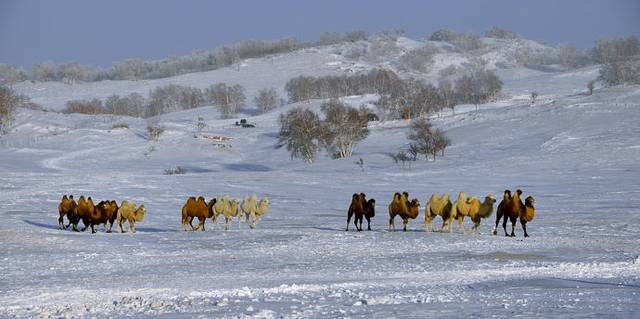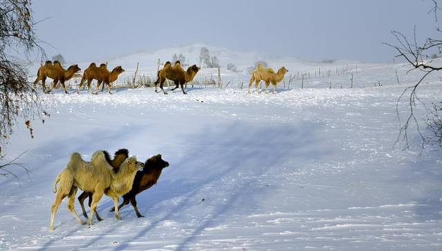 冰天雪地中,骆驼群、羊群的行进十分壮观。