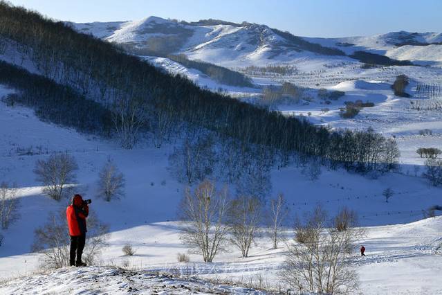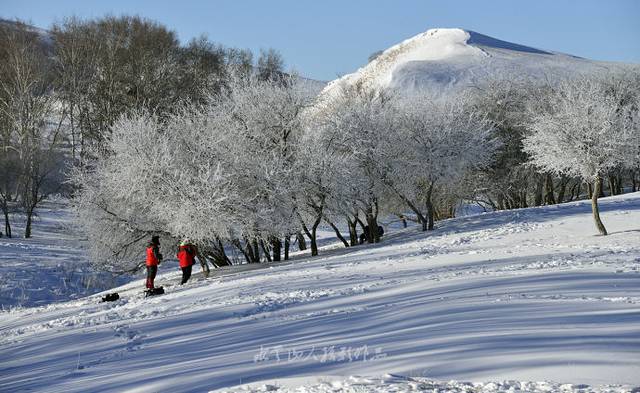 大约7:45分,太阳从东方的山脊漏出了红色的笑脸。少顷,树木、丘陵、雪原都抖擞精神,银装素裹,披红挂彩,显得分外妖娆。