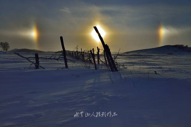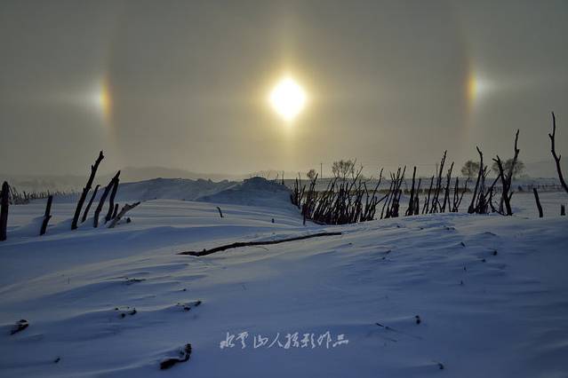 下午14:30上车出发,先到西河头村拍摄小村、牛圈和日珥。白毛风刮得很大,感觉非常冷,几乎令人招架不住,真正尝到了“风头如刀面如割”的严寒味道。坝上地区因海拔从七八百米急速上升至近两千米的巨大落差,形成了特殊的气候状况。每年进入冬季,极度严寒的坝上地区就会成为许多人神往却不敢涉足之地。天气最冷能达到零下三四十度,滴水成冰,如果漫天大雪伴着狂风怒吼,便是白毛风了。