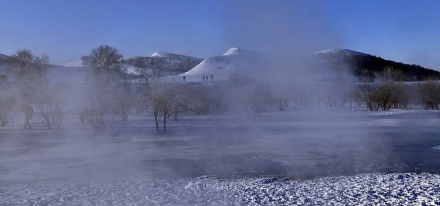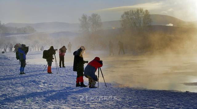 冰天雪地中,小河口有一段河水没有完全结冰,雾气腾腾,引来大家一阵狂拍。