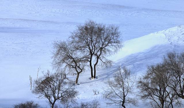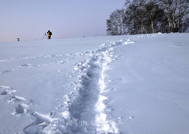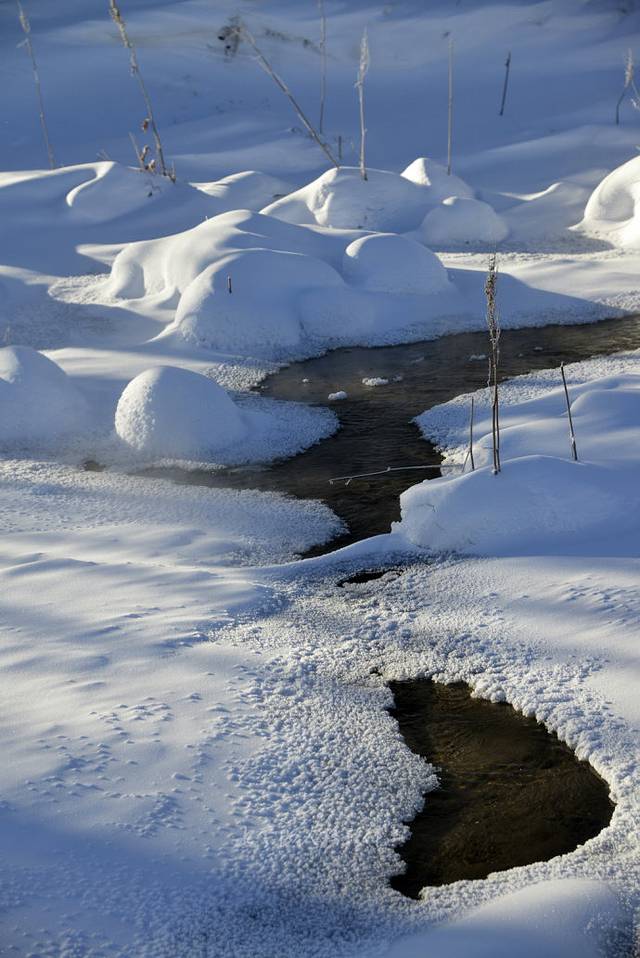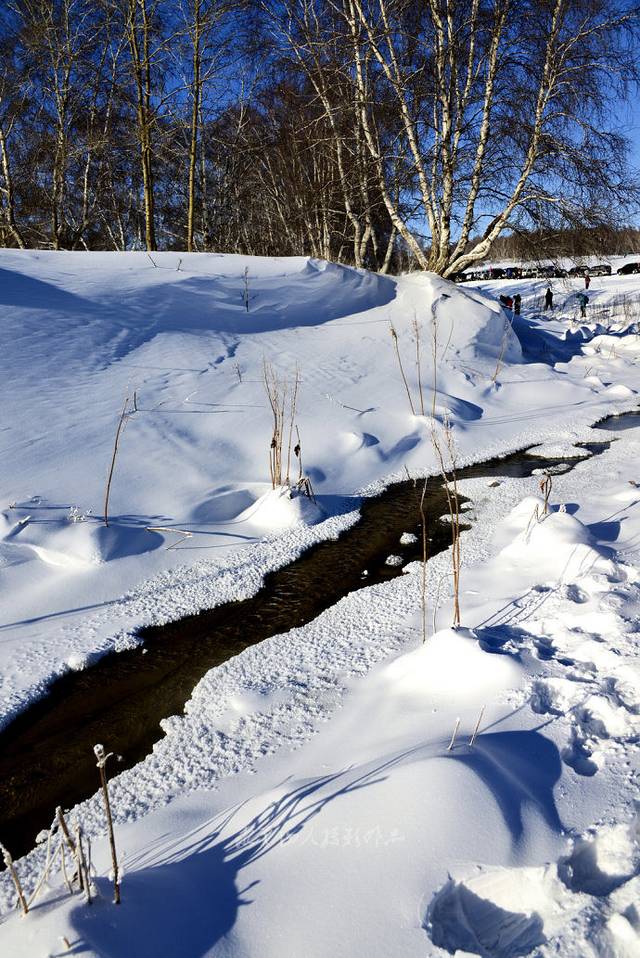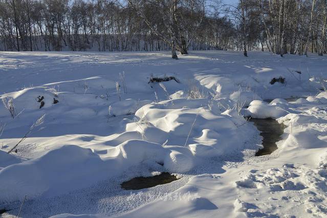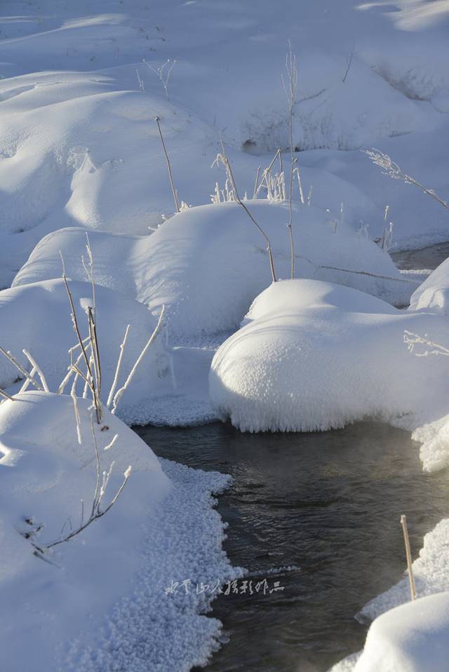之后,赶到附近一小河谷处拍摄雪馒头景观。当其时也,阳光灿烂,气清风微。整个小河沟中,夏天一个个绿草土包如今变成了一个个洁白纯净的雪蘑菇。河水在冰雪缝中蜿蜒穿行,冒着蒸汽。岸上的大片白桦林,树上挂满了银白色的雾凇,饱经沧桑的白桦躯干在没有人类踩踏过的雪地上投下修长漂亮的阴影,形成了一幅幅别样的北国晴雪图。
