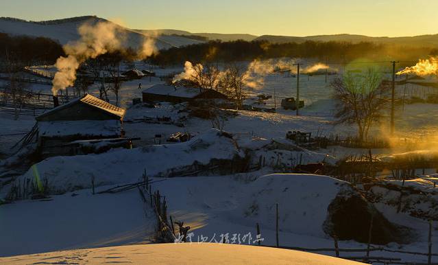 到三拐子沟村拍摄山村炊烟和日照雪山桦林。