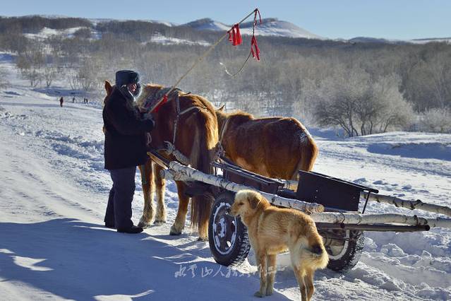 这是在雪地供有人有偿拍摄的马车、狗和赶车人。