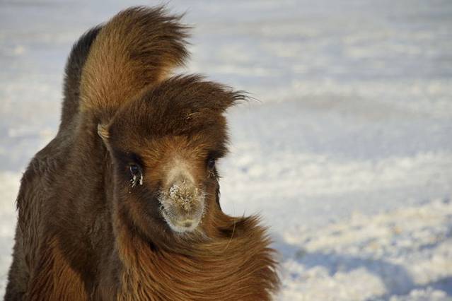 我们租的4头骆驼在沙梁子上艰难行进,有一头骆驼甚至突然摔倒在雪地上,被拖了一段距离、众人喊叫后才被驭驼人发现。