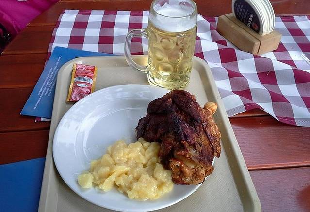 发现这里还有北海鱼店(Nordsee),想来大家都知道,是日本一家连锁店,主要是海鲜品种,炸虾很好吃,面包夹三文鱼也不错。几个啤酒屋有很多啤酒品种,我们继续要了Radler啤酒,淡淡的黄色,女生肯定喜欢,1L杯3.5欧元(离开慕尼黑后,果然再也没有喝到这个口味)。猪肘一份是半个,好像是7.5欧元,还给搭配一些蔬菜。总之3个人30欧元以内就搞定了,很爽!
