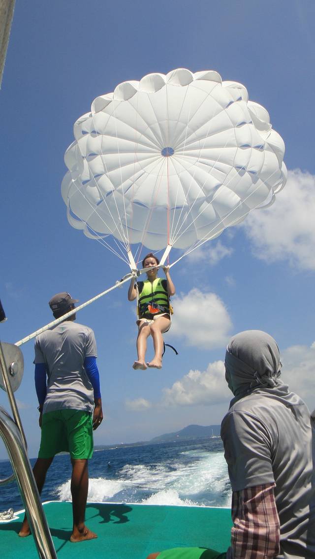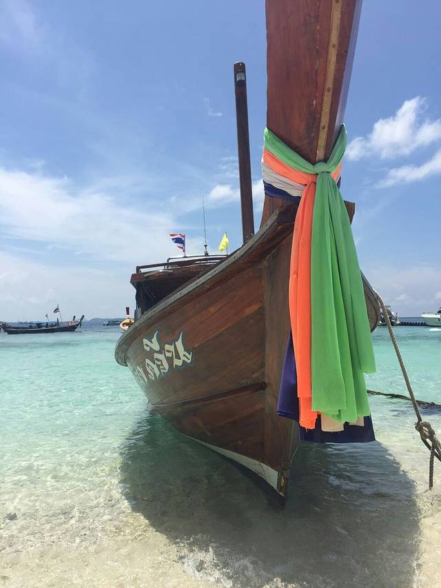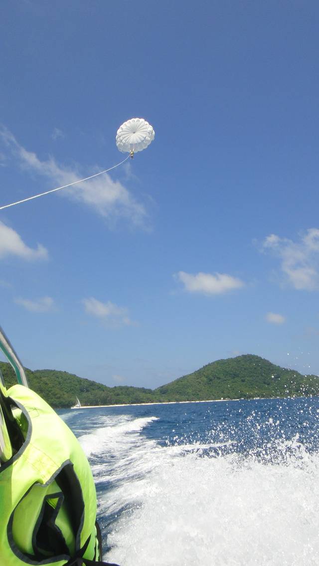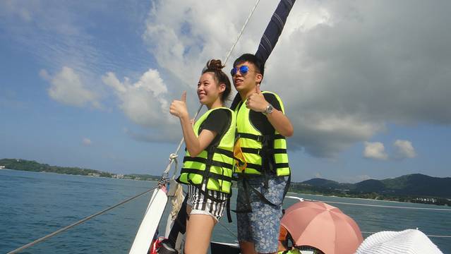 预订的也是浪花朵朵家的,中文导游。他们家的接送车有个明显的特点就是车前会挂很多装饰物。选择的是双体帆船500RMB一个人,但我和毛哥还选择了拖伞是260RMB一个人,由于第三四天住的都是奈通海滩的Pullman所以接车的话会有点麻烦,不过可以和卖家沟通,多加点钱就来接人。