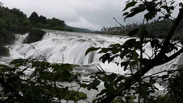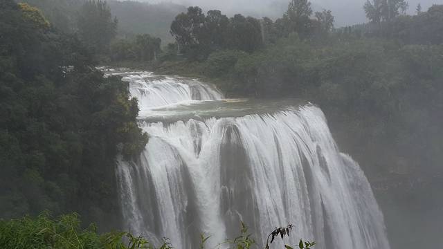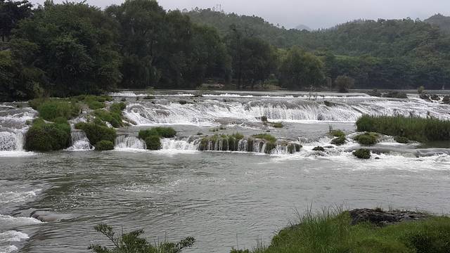 黄果树瀑布景区并不是只有一个瀑布,它包括陡坡塘瀑布、天星桥景区、黄果树大瀑布三个景区,陡坡塘瀑布景点单一,85版《西游记》主题曲唐僧师徒四人牵马过河的场景就在此取景。因为下雨,人又多,所以路上还有点儿小堵。