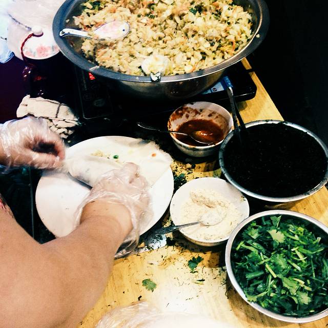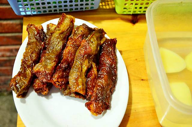 它用一种专门的豆皮,裹上剁碎的精肉、荸荠、葱等,包成如春饼的一条条,再放下油锅炸成焦黄,切成几段,蘸佐料进食。买了一根试吃,我不是很喜欢这种味道,有点醉。
