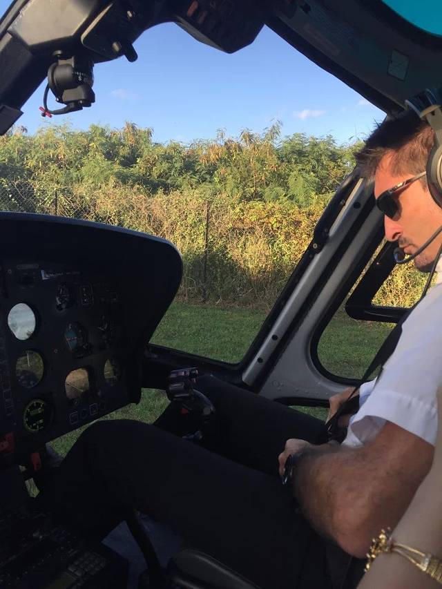 我的帅哥机师,很般配有木有?另外乘坐直升机不是你想坐哪个位置就坐哪里,首先要经过称体重的程序,然后机师会按照每个乘客的体重来分配座位。呵呵,本小姐因为体重非常轻,所以坐的位置也是观景最好滴。
