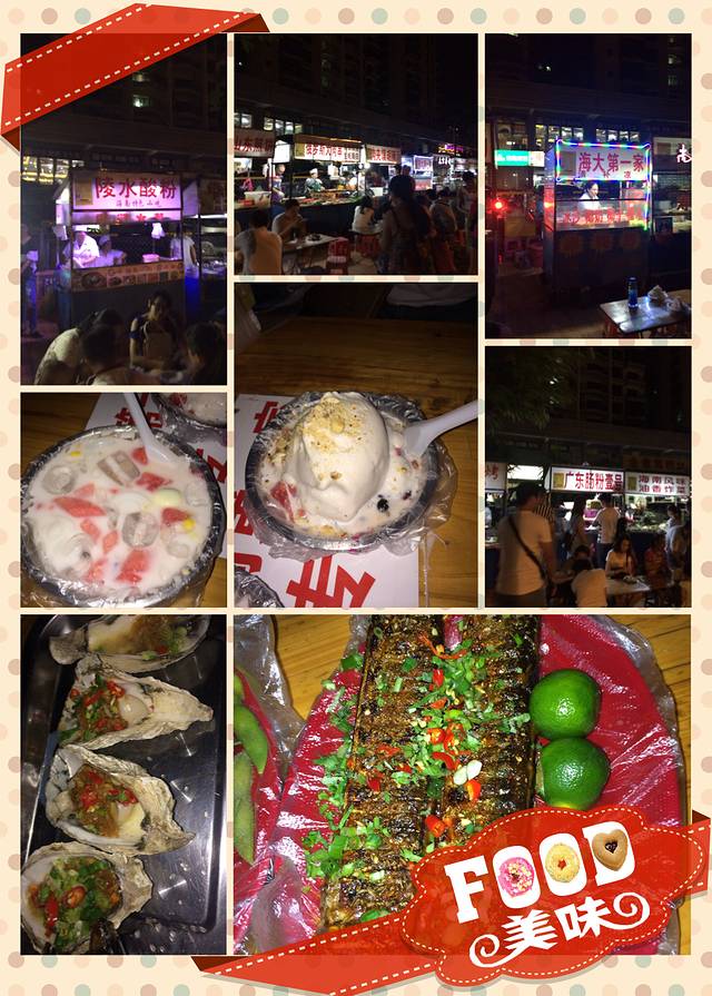 海南大学门口有很多小吃,可以一家吃一点。主推的有“海南第一家清补凉”和海鲜烧烤,这个全看个人喜好,就不重点说明了。
