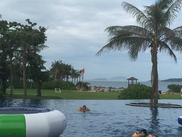 2、住宿:海棠湾目前有很多大品牌的酒店,海棠湾的酒店普遍很新,开业就是两三年,不管从设施、还是服务都是三亚目前性价比最高的。我们住的是海棠湾九号,酒店最有特点的是无边游泳池和相对独立的地理位置、距离希尔顿、喜来登那一片的酒店群还有一段距离,所以非常安静,而且沙滩超大。海水也是不错。